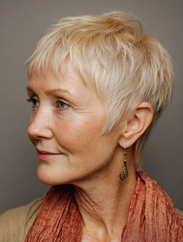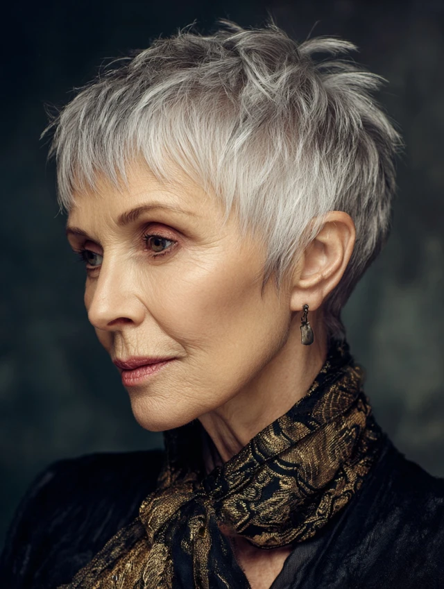 Short, choppy bangs in a pixie cut add structure and personality without weight.