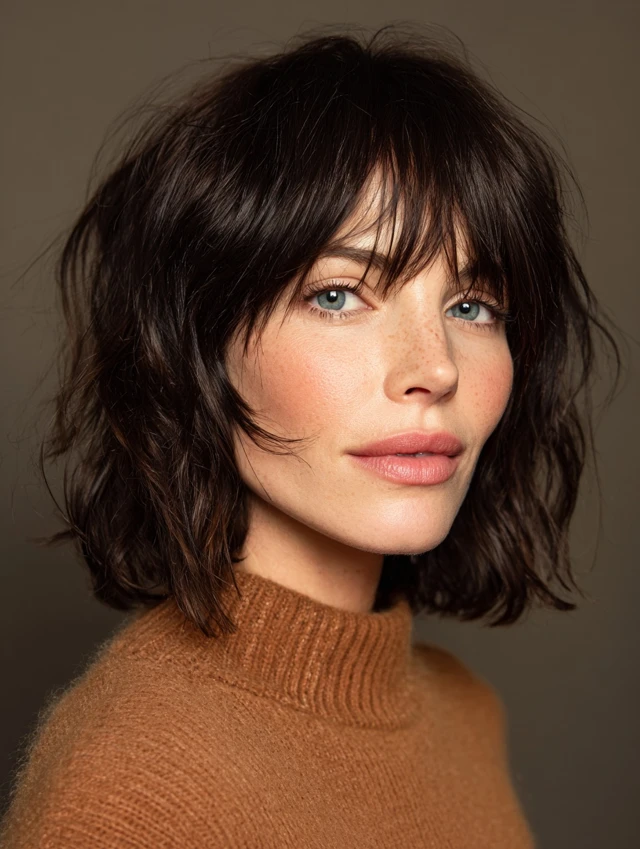 Curtain bangs soften the face while blending naturally with layered shag cuts.