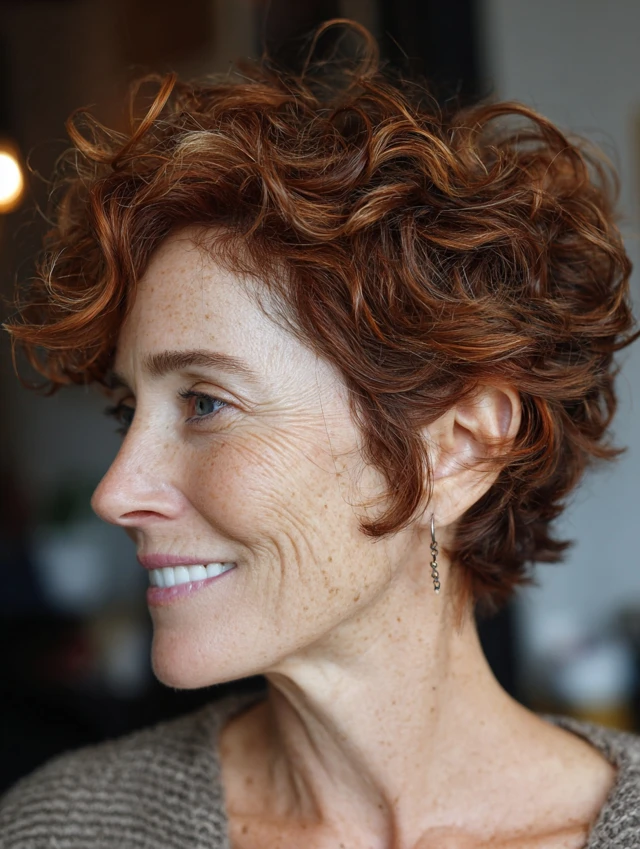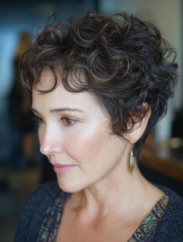 A short curly pixie highlights natural texture while offering a bold and easy-to-maintain style.