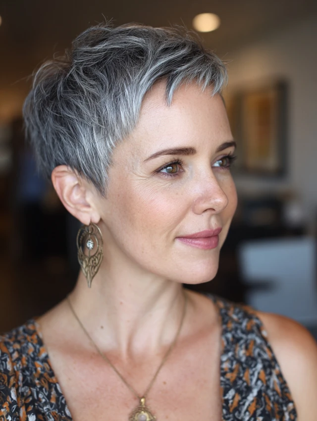 Short hair emphasizes contrast and showcases silver strands beautifully.