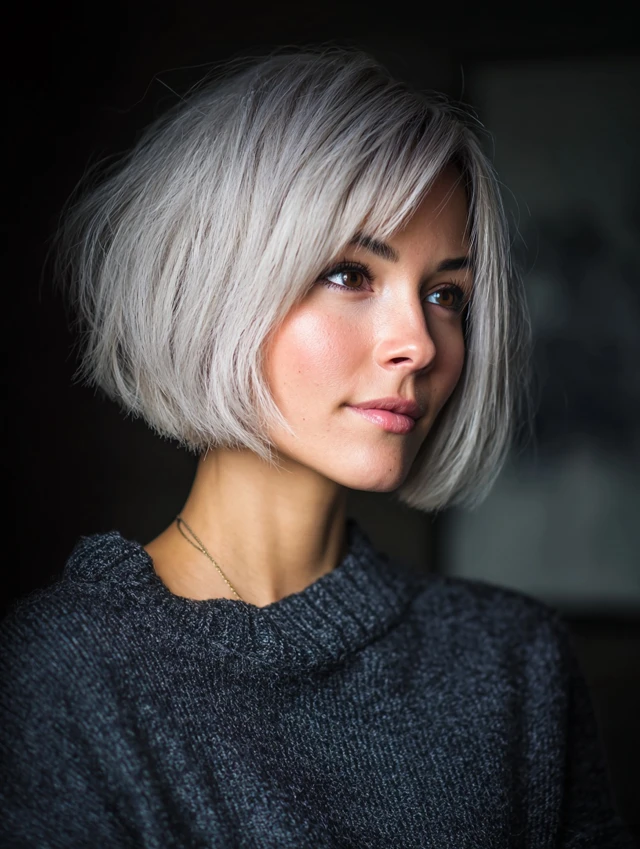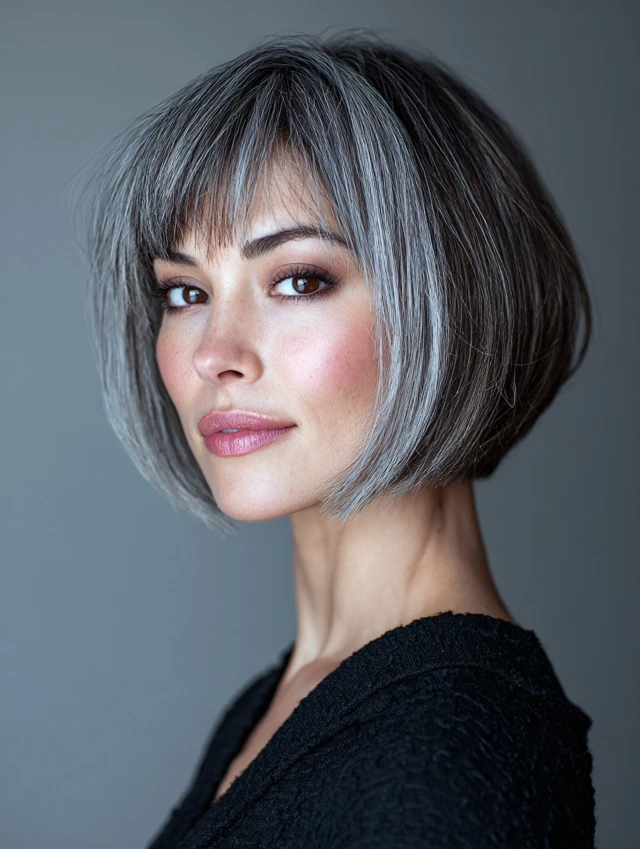 A bob highlights the natural blend of gray and dark tones while keeping hair structured.